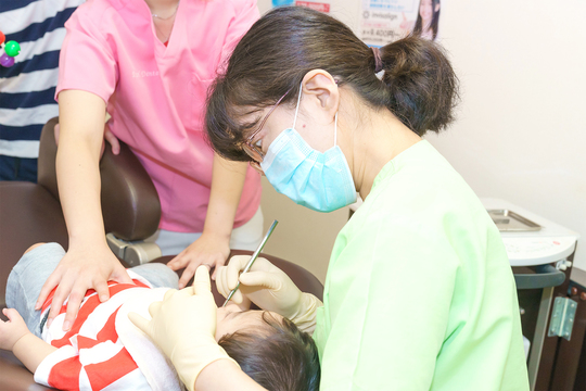 当院では、院長とともに、女性の副院長が小児歯科を担当。この点も、多くの患者さんに喜ばれています。女性の歯科医師は、乳幼児や就学前のお子さんに怖がられることが少なく、治療を受け入れてもらいやすい傾向にあるからです。