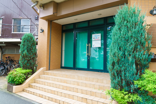 駅から来院される際は、先に裏玄関が見えます。道なりに進み、表玄関へ回っていただき、医院の正面玄関より来院ください。